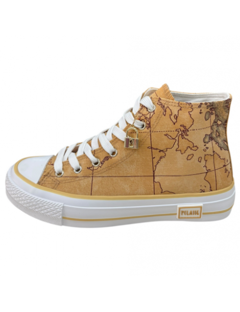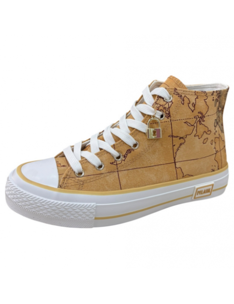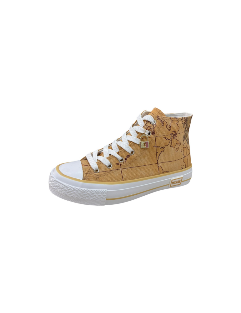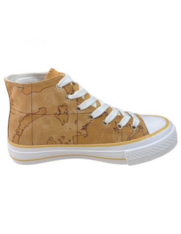 Sneakers alte in canvas beige con elegante stampa mappa geografica. Design moderno con lacci bianchi, suola in gomma resistente e stile casual perfetto per outfit urbani e quotidiani.
