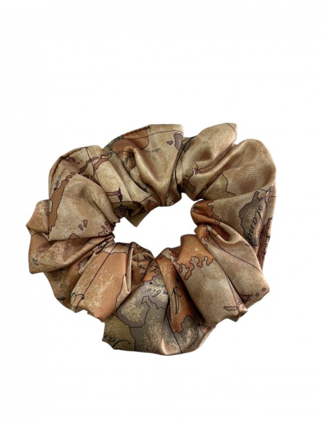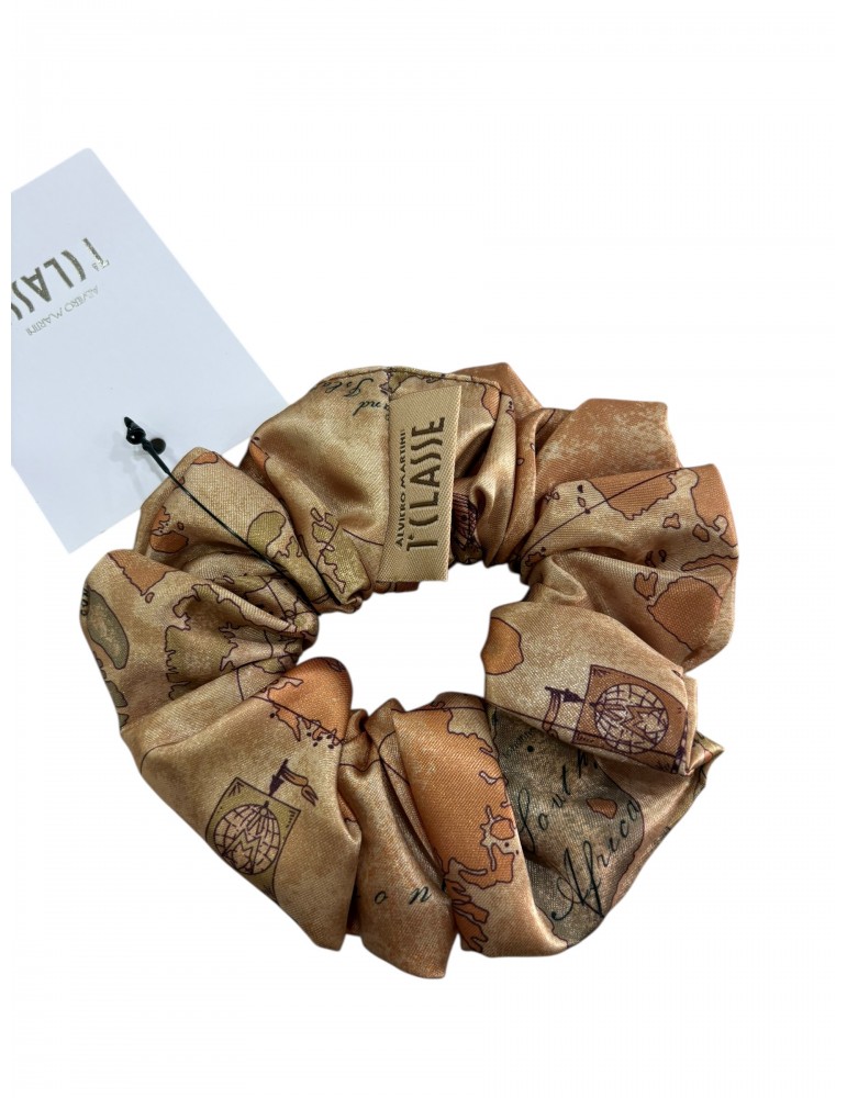 Elegante scrunchie Alviero Martini 1ª Classe, realizzato in tessuto satinato con iconica stampa Geo Classic.