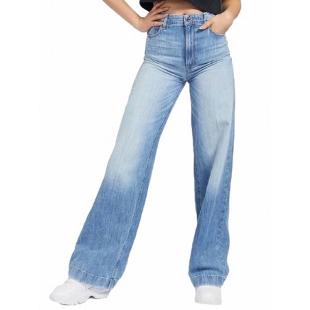 Jeans della nuova collezione P/E firmata Guess. Modello con taglio a zampa, due tasche centrali, passanti per la cintura. Lavaggio chiaro.
