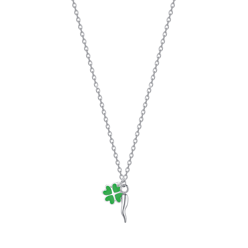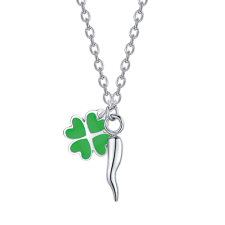 COLLANA BAMBINA IN ACCIAIO CON CORNO E QUADRIFOGLIO VERDE