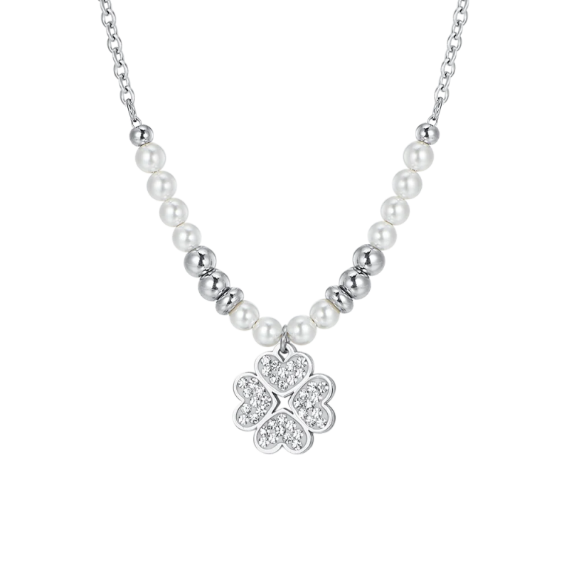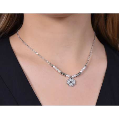 COLLANA DONNA IN ACCIAIO CON PERLE E QUADRIFOGLIO