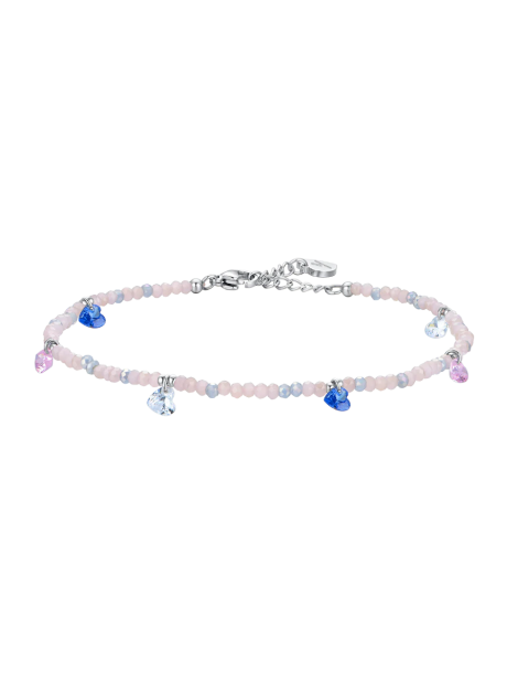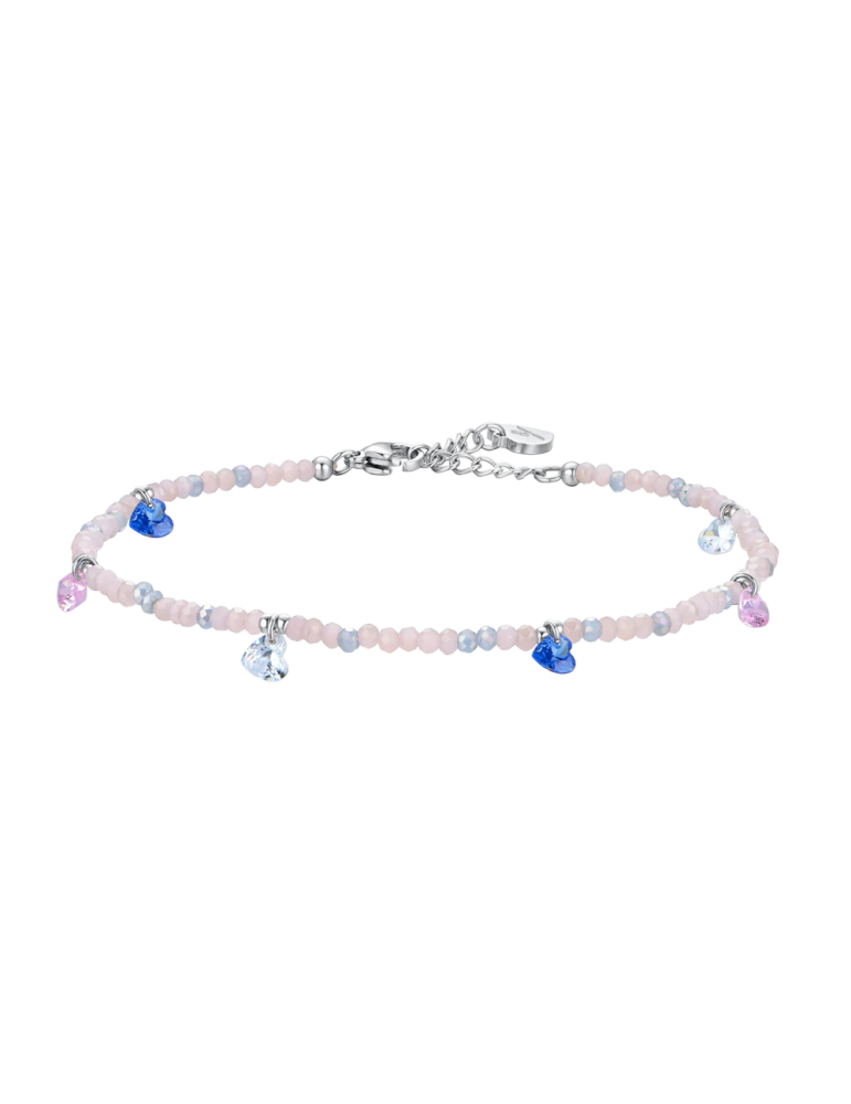 Cavigliera Donna in acciaio con pietre rosa e celesti e cristalli multicolor. Lunghezza: 22 + 3 cm. Diametro pietre: 3 mm. Diametro elemento: 2 mm. Misura cristalli: 5 x 3 mm. Grazie al suo design versatile, questa cavigliera è perfetta per completare outfit casual estivi o aggiungere un tocco di personalità a un abbigliamento più formale. Puoi indossarla con sandali o scarpe aperte per un effetto elegante e fresco, o abbinarla ad altri gioielli per un look più audace e giocoso. I cristalli multicolor, con le loro molteplici sfumature, riflettono la luce in modo dinamico, creando un effetto scintillante e accattivante