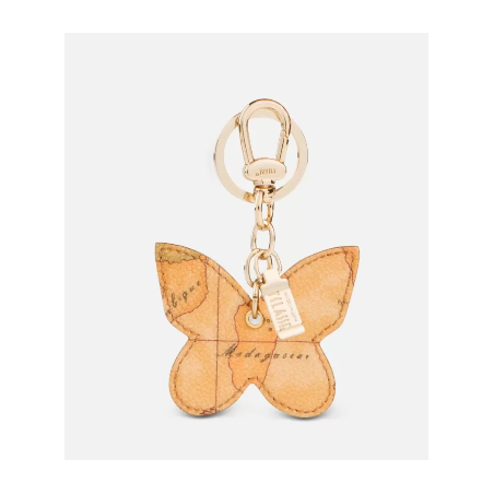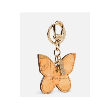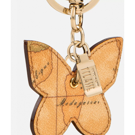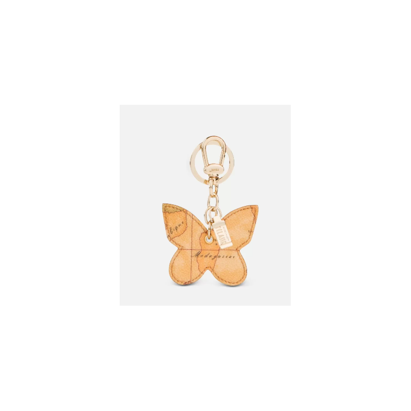 Portachiavi a forma di farfalla in tessuto stampato con cartina geografica Geo Classic con dettagli in pelle liscia di bovino color cuoio, metalleria in oro chiaro con logo 1AClasse, dicitura Made in Italy impressa a caldo sul retro. Utilizzalo anche anche come charm per impreziosire le borse di collezione.