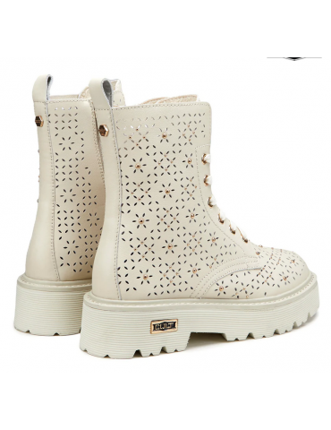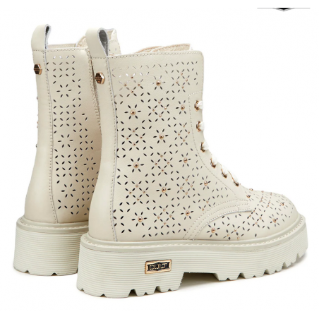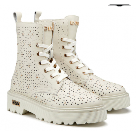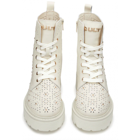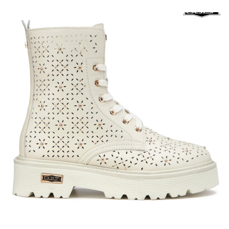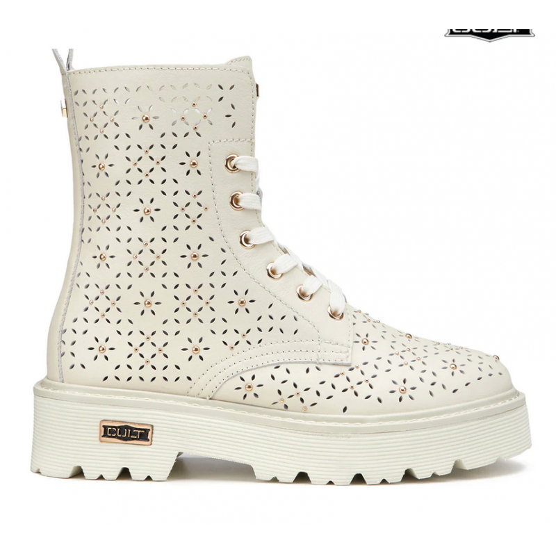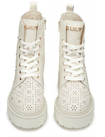 Spirito urbano e dettagli accattivanti si incontrano in questi anfibi in pelle con forature floreali, gentili e femminili e la nuance off-white che richiamano la sensazione della bella stagione. Questi anfibi in pieno stile Cult doneranno un tocco grintoso ai tuoi look casual. Chiusura tramite stringhe e zip interna, fondo in EVA