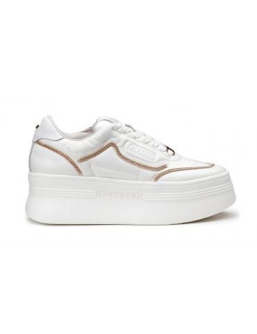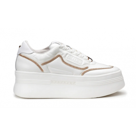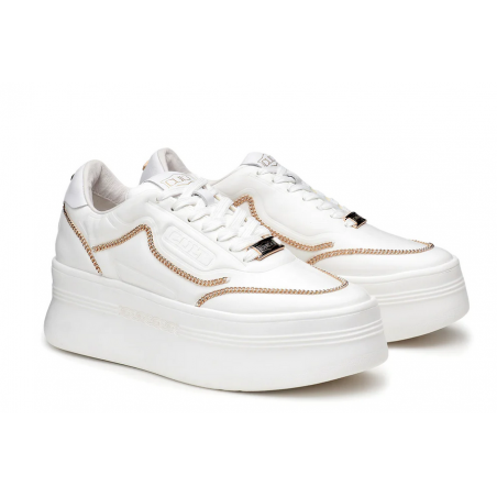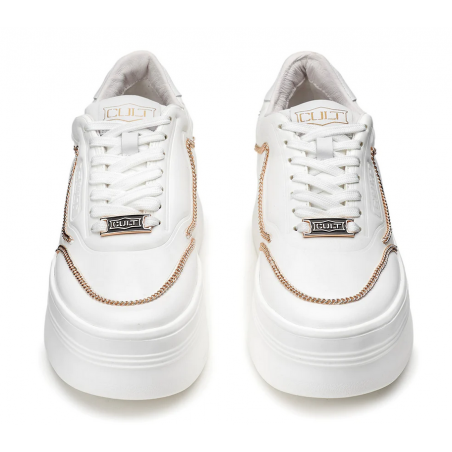 Linee bold per queste sneakers platform in pelle bianca grintosa, tipicamente Cult. La suola in EVA ha una laseratura laterale che riporta l’accessorio più rappresentativo del brand, la catena. Presentano il logo sulla linguetta, contrafforte e lato esterno. Attuali e confortevoli saranno perfette per aggiungere carattere a look casual e formali.