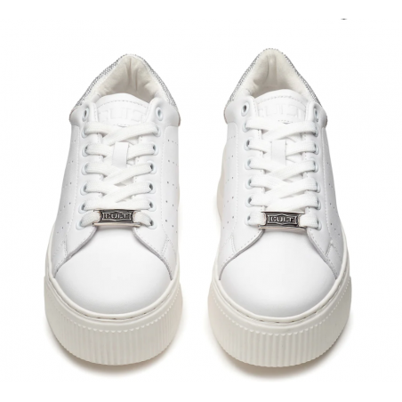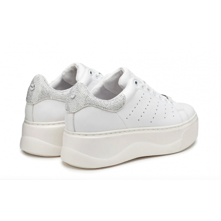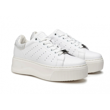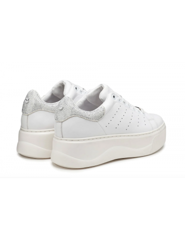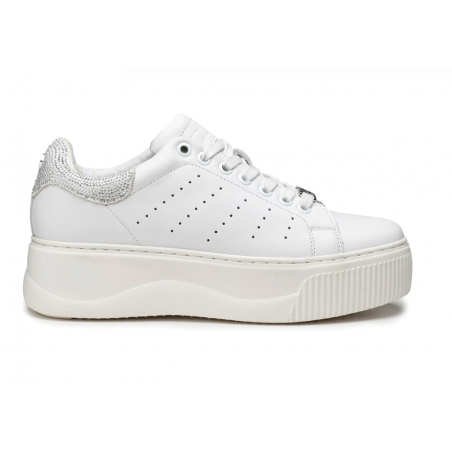 Total white per le sneakers in pelle firmate Cult per questa primavera estate. Lacci sur ton e il dettaglio glitterato argento sul retro della scarpa per un effetto davvero glamour. Da indossare sotto un vestito slim e blazer per un mix moderno e d'effetto. Altezza suola 5,3cm