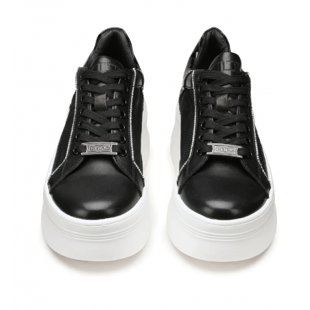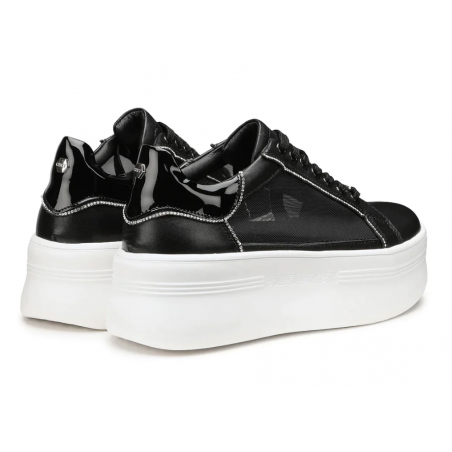 Descrizione: linee bold per queste sneakers platform in pelle nera con gli inserti in rete e profili in strass, audaci e grintose in pieno stile Cult.