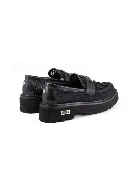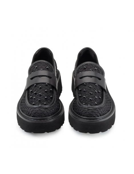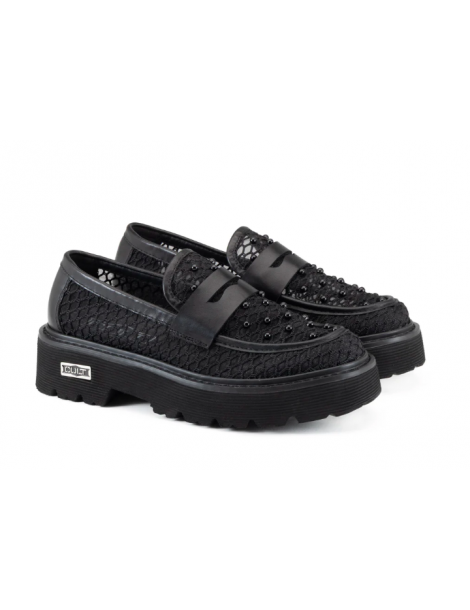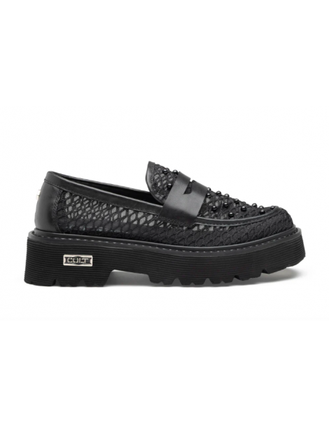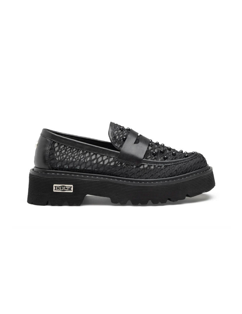 Questo mocassino Slash fonde l’anima black di Cult con un design in mix, pelle e mesh, ultra-contemporaneo valorizzato da micro-borchie grintose tono su tono. La maxi suola platform carrarmato assicura un’attitudine bold, mentre le trasparenze aggiungono un tocco glam-rock irriverente. Perfetto per chi domina la strada con stile deciso.