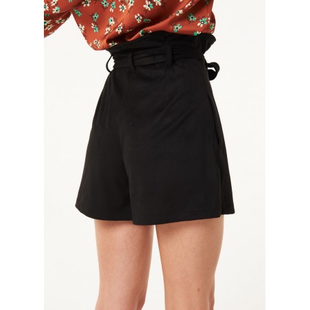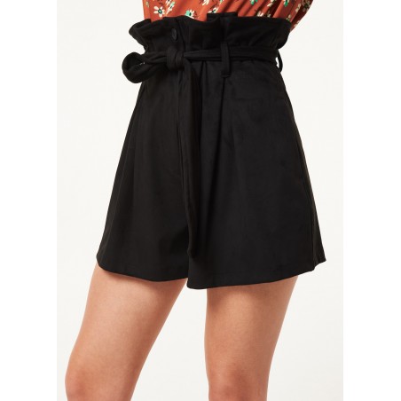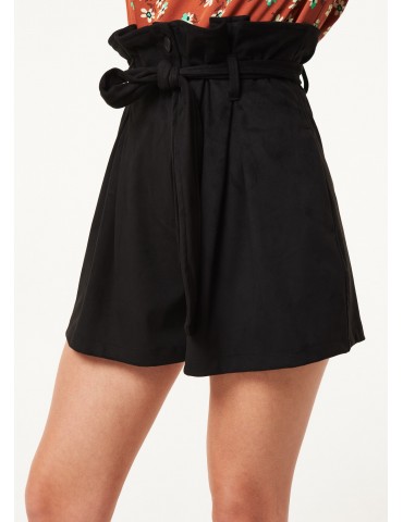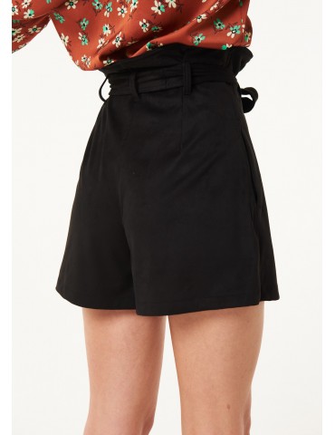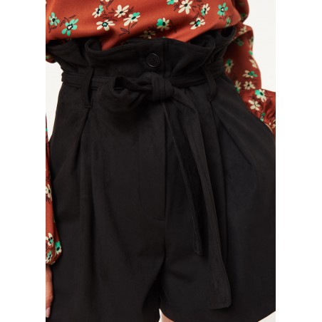 Bermuda dalla linea ampia realizzati in suede.Il modello ha vita alta arricciata con fusciacca coordinata e tasche sui fianchi.